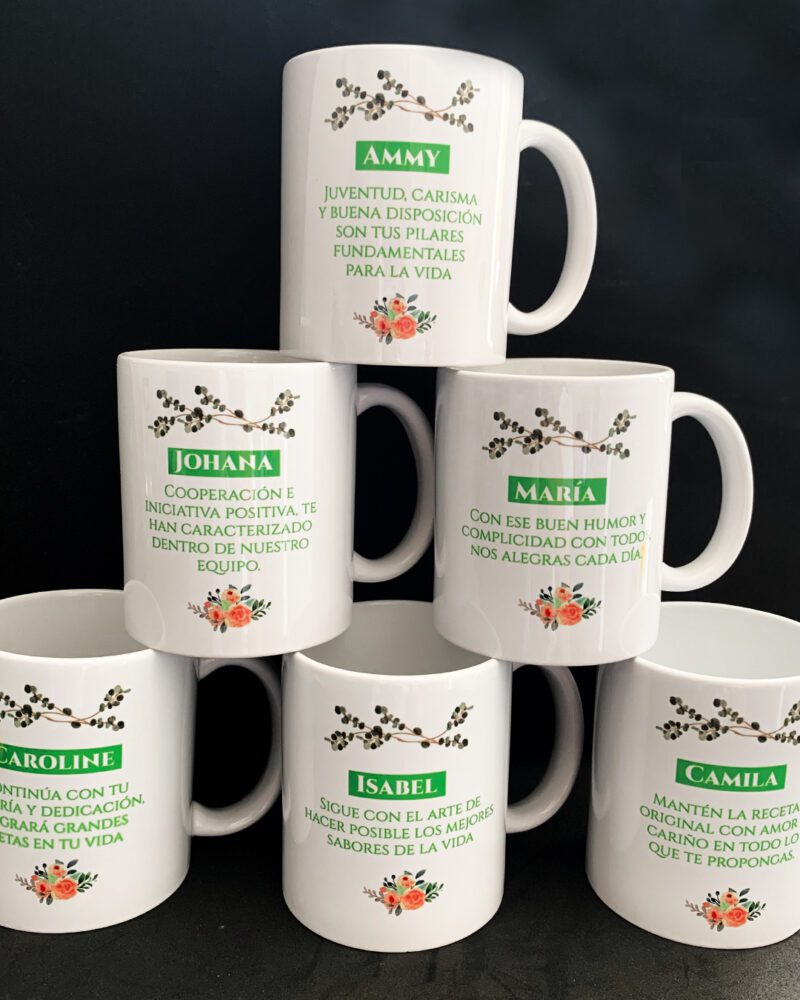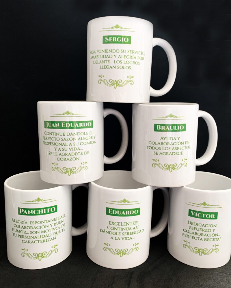 Creamos tazones personalizados con el nombre de cada integrante del equipo y una frase que representa su esencia, compromiso y personalidad.